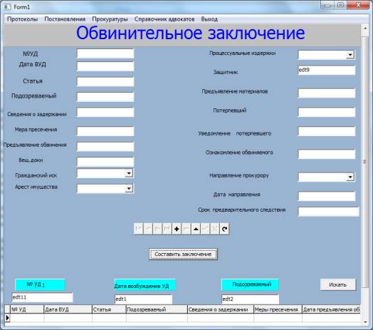 Оболочка системы состоит из 5 форм и 7 модулей данных, содержащих объекты базы данных и SQL запросы. Первая форма – Form1 выполняет функции главного окна программы и содержит поля для заполнения обвинительного заключения (см. рис. 1).