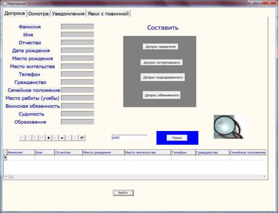 Переход с главной формы на форму «Протоколы» (см. рис. 2) открывает следователю возможность для автоматического заполнения протоколов допросов, осмотров и т.п. Их составление аналогично составлению справки обвинительного заключения. Вся введенная информация также поступает в базу данных системы и может использоваться при поиске сведений по конкретному лицу. Чаще всего следователю требуется найти номера телефонов допрашиваемых лиц и понятых.