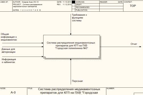Контекстная диаграмма проектируемой системы распределения медикаментозных препаратов для медицинского учреждения КГП на ПХВ «Городская поликлиника №3» представлена в соответствии с рисунком 1.
