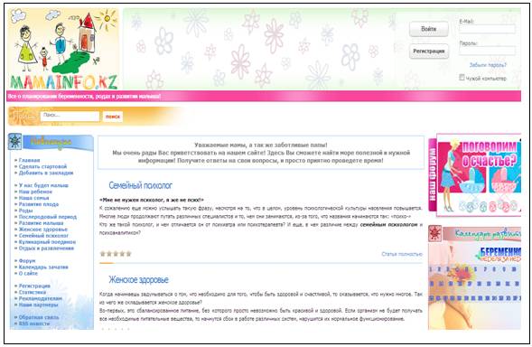 соответствии с рисунком 1 представлена главная страница «Сайт для мам и детей