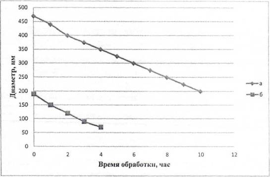 1 − Зависимость диаметра целлюлозных наносфер от времени обработки смесью