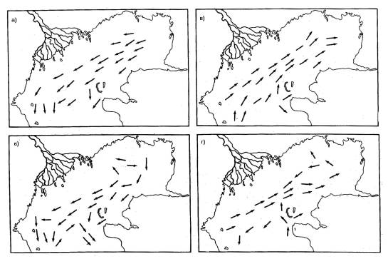 черты циркуляции вод, преобладающие течения при различных ветровых полях КАСПИЯ
