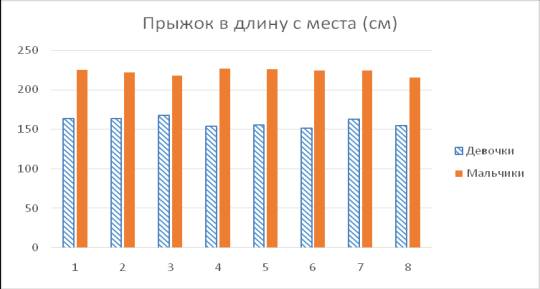 до224,26±1,83 (p>0,05), на 8 этапе обследования показатели теста прыжок в длину