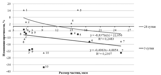 Анализируя графики зависимости прочности от размера вводимых в цемент