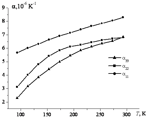 визначення всіх незалежних компонент тензора термічного розширення akl в інтервалі 83–303 К,