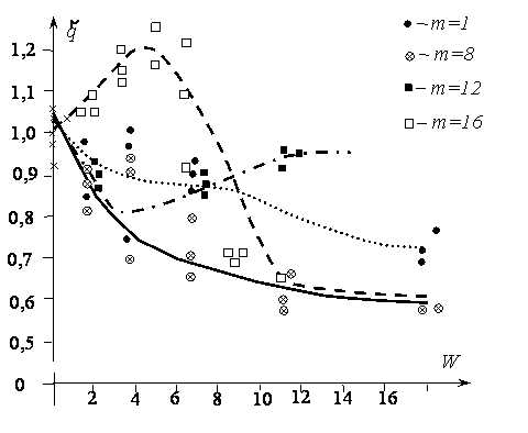 воздействий (m = 1, 2, 4, 8, 12, 16) с фиксированной