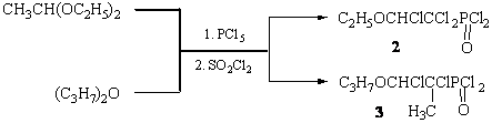 и 31Р спектров в результате реакций образуются дихлорангидриды 1,1,2-трихлор-2-этоксиэтил- (2) и 1-метил-2-пропокси-1,2-дихлорэтилфосфоновых кислот (3) в виде смеси стереоизомеров.