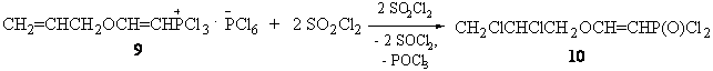 Реакции пятихлористого фосфора с такими О-нуклеофилами как диалкиловые эфиры, a-хлорэфиры, ацетали и полуацетали приводят к 2-алк-оксивинилтрихлорфосфоний гексахлорфосфоратам (1), которые при действии различных реагентов (сернистый газ, сероводород, белый фосфор, фосфин и др.) превращаются в дихлорангидриды 2-алкоксивинилфосфоновых, -тиофос-фоновых или -фосфонистых кислот [1, 2]. При использовании диметил-сульфата, как было показано в работе [3], образование фосфорильной группы сопровождается хлорированием по двойной связи, что было объяснено промежуточным образованием хлористого сульфурила. В связи с этим с целью получения новых типов фосфорорганических соединений (ФОС) и расширения ассортимента агентов разложения нами было изучено взаимодействие хлористого сульфурила с гексахлорфосфоратами (1).