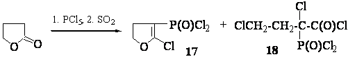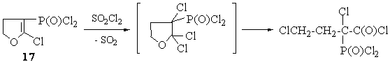 Наши исследования показали, что при обработке промежуточного аддукта g-бутиролактона и пятихлористого фосфора хлористым сульфурилом образуется только хлорангидрид (18) (dР 37.0 м.д.). Последний был получен также взаимодействием дихлорангидрида 5-хлор-2,3-дигидрофурил-4-фосфоновой кислоты (17) с хлористым сульфурилом.
