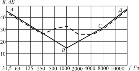 СН и П (глава 12 «защита от шума») наклон отрезка ВА принимается равным 6 дБ/октава, а отрезок СД – 8 дБ/октава. Из графика частотной характеристики следует, что в