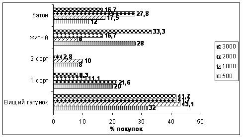 (спостереження, що проводилося у містах продажу хлібопродуктів). Розмір виборки при опитуванні споживачів склав 200