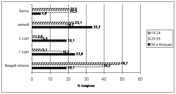 вік споживачів, можна зробити висновок, що найчастіше хліб вищого гатунку