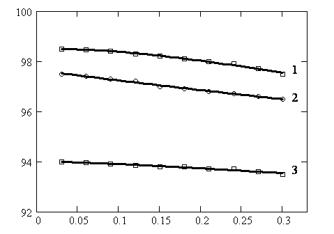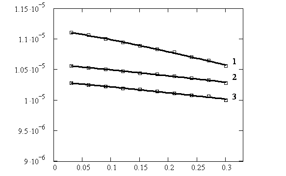 Обозначения кривых: скорость потока: 1 – 0,1 м/с; 2 – 0,08 м/с; 3 – 0,03 м/с.