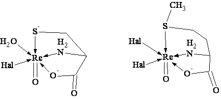 Октаэдрическая конфигурация, характерная для комплексов оксорения(V), достраивается случае комплексов цистеина за счет молекулы воды. Таким образом, можно предположить следующую структуру внутренней координационной сферы синтезированных комплексных соединений: