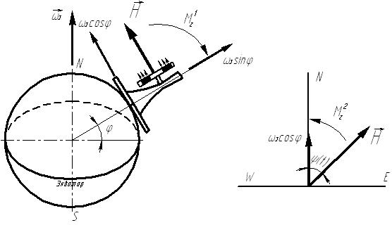 совместить ось ротора с горизонтальной составляющей вращения Земли (рис. 1,в):